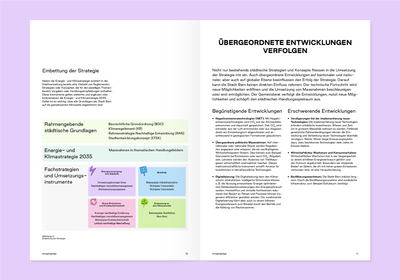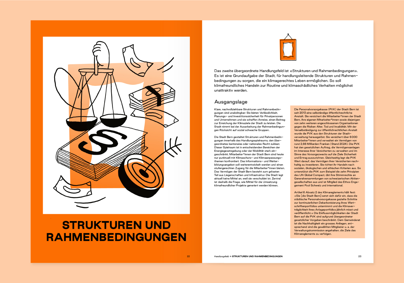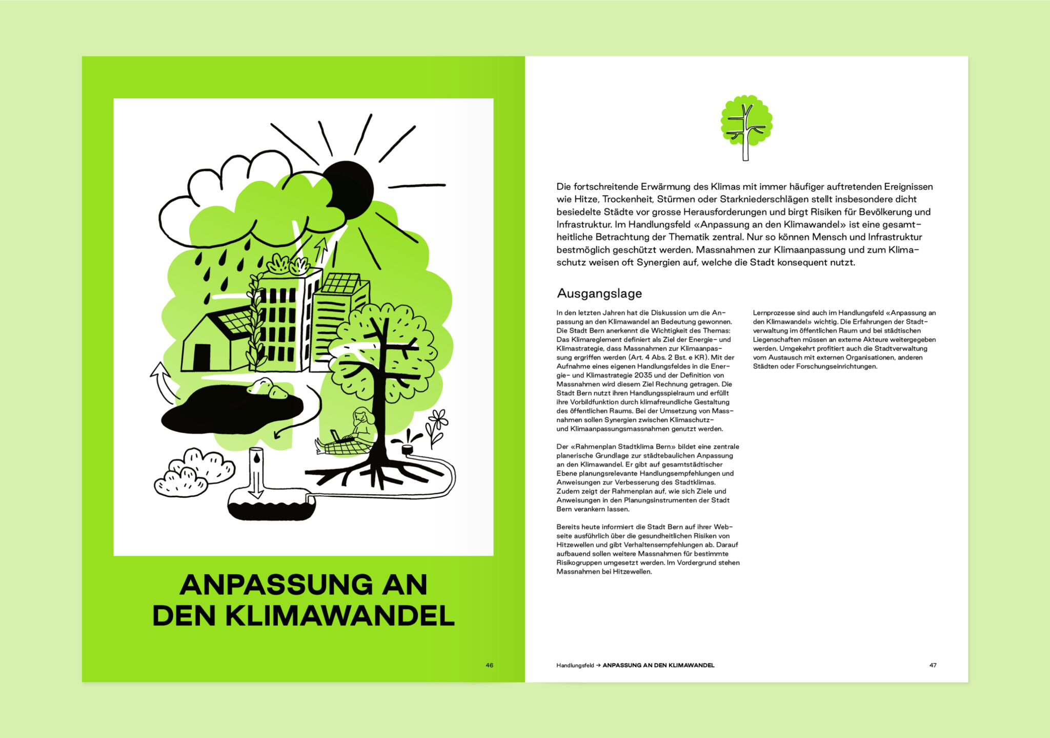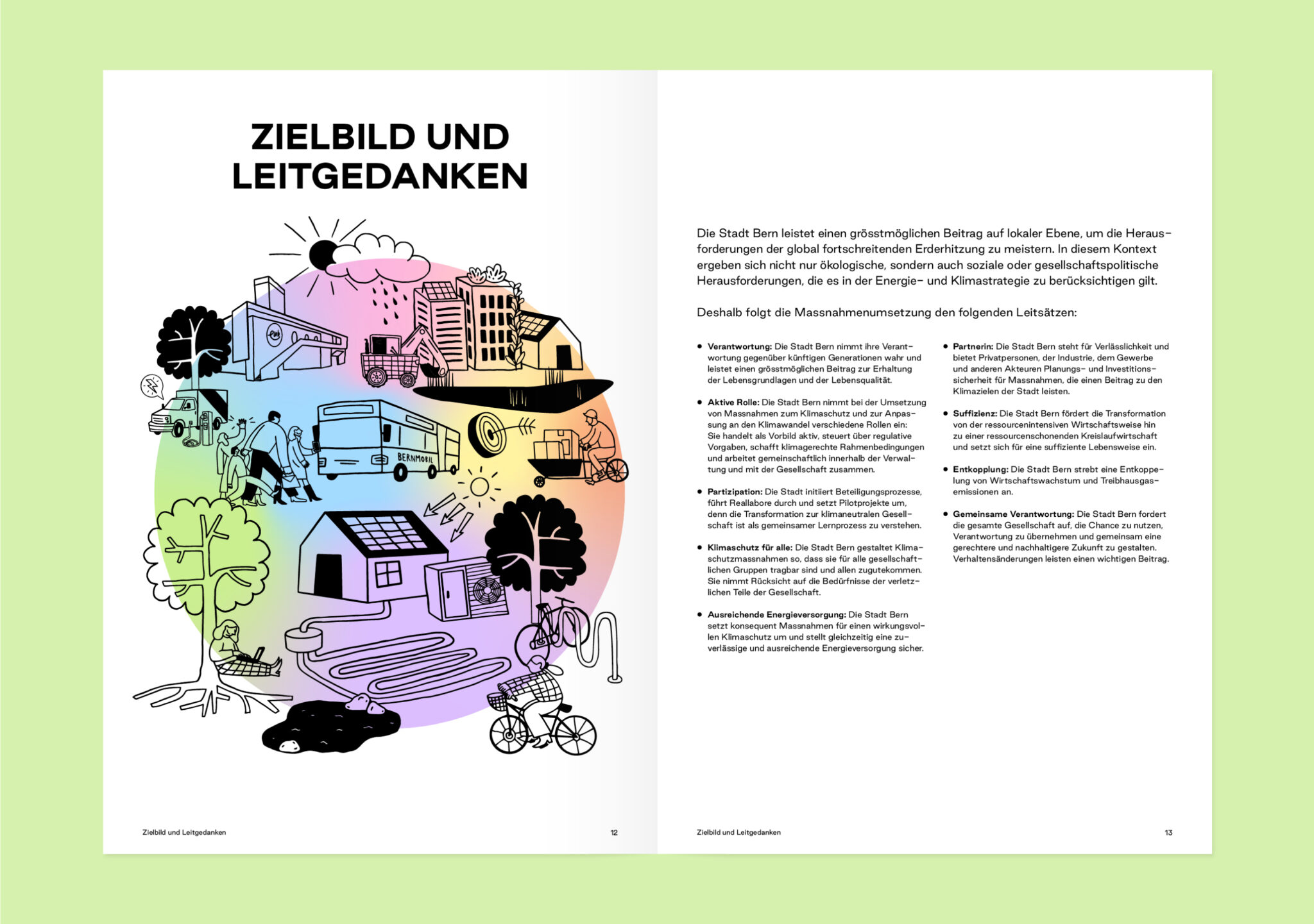 Mit einer bewussten Kombination von Farben und Illustrationen haben wir die unterschiedlichen Handlungsfelder visualisiert, das grafische Konzept erarbeitet und die Umsetzung vom Bericht, über die 49 Massnahmenblätter bis hin zur technischen Dokumentation einheitlich gewährleistet.