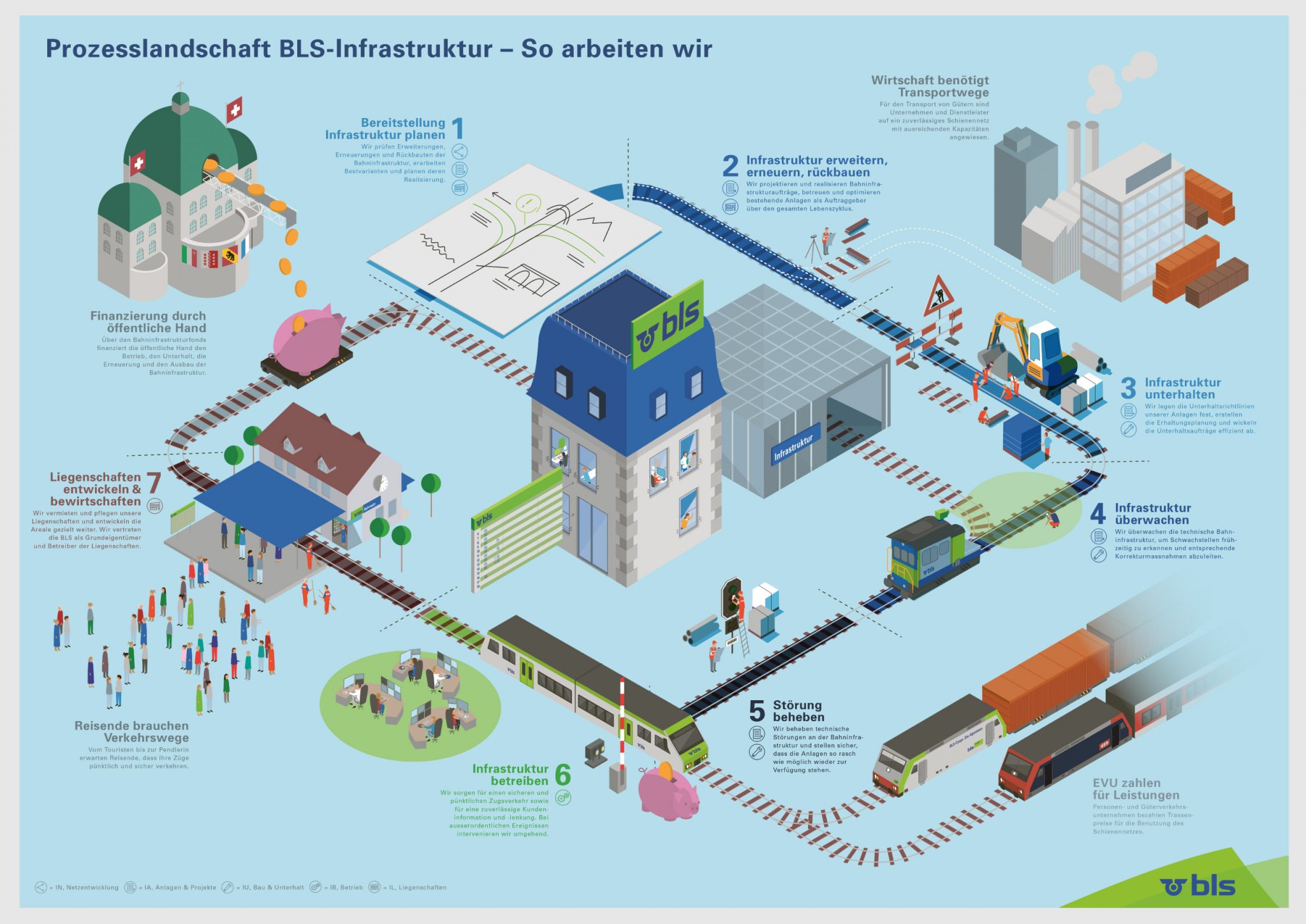In Zusammenarbeit mit Klarkom haben wir für die BLS eine Prozesslandschaft kreiert, welche den Mitarbeitenden eine Orientierung über die Wertströme geben soll. Wir haben uns für eine isometrische Visualisierung entschieden, um einen guten Überblick zu gewährleisten.