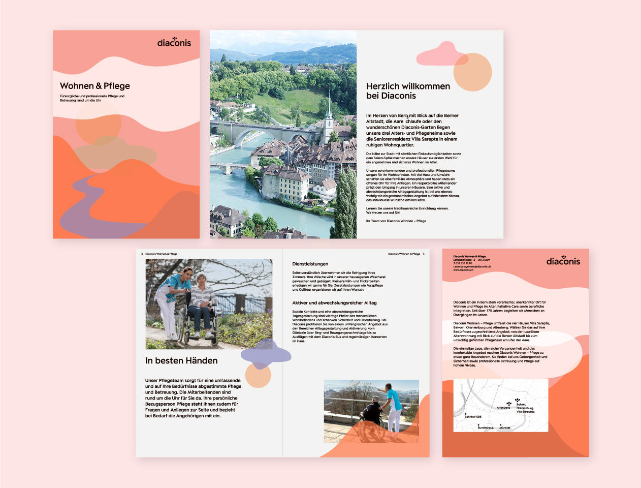 Begleitet wird das neue Design von grafischen Landschaftsillustrationen, welche abstrakte Ebenbilder der Aussichten der jeweiligen Standorte darstellen. Für die verschiedenen Arbeitsbereiche haben wir jeweils eine Grundfarbe definiert, welche dem Bereich eine gewisse Eigenständigkeit verleiht. Allgemeine Dokumente der Stiftung Diaconis beinhalten eine Kombination aus verschiedenen grafischen Elementen der unterschiedlichen Bereiche.