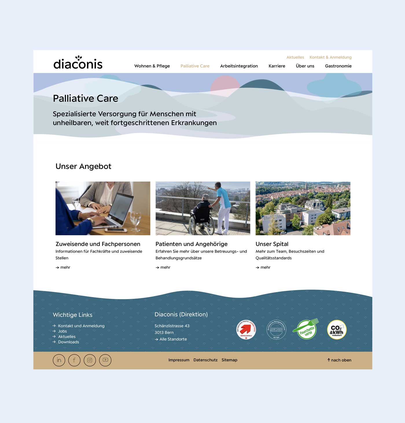 Diaconis betreibt die drei Geschäftsbereiche Wohnen & Pflege, Palliative Care und berufliche Integration. Seit der Gründung 1844 setzt sich die traditionsreiche Non-Profit-Organisation dafür ein, dass Menschen in fragilen Lebenssituationen gemäss ihren Bedürfnissen versorgt, gepflegt und begleitet werden. Mit dem Redesign haben wir einen zukunftsorientierten und modernen Look entwickelt, welcher die Traditionswerte der Stiftung aufgreift.