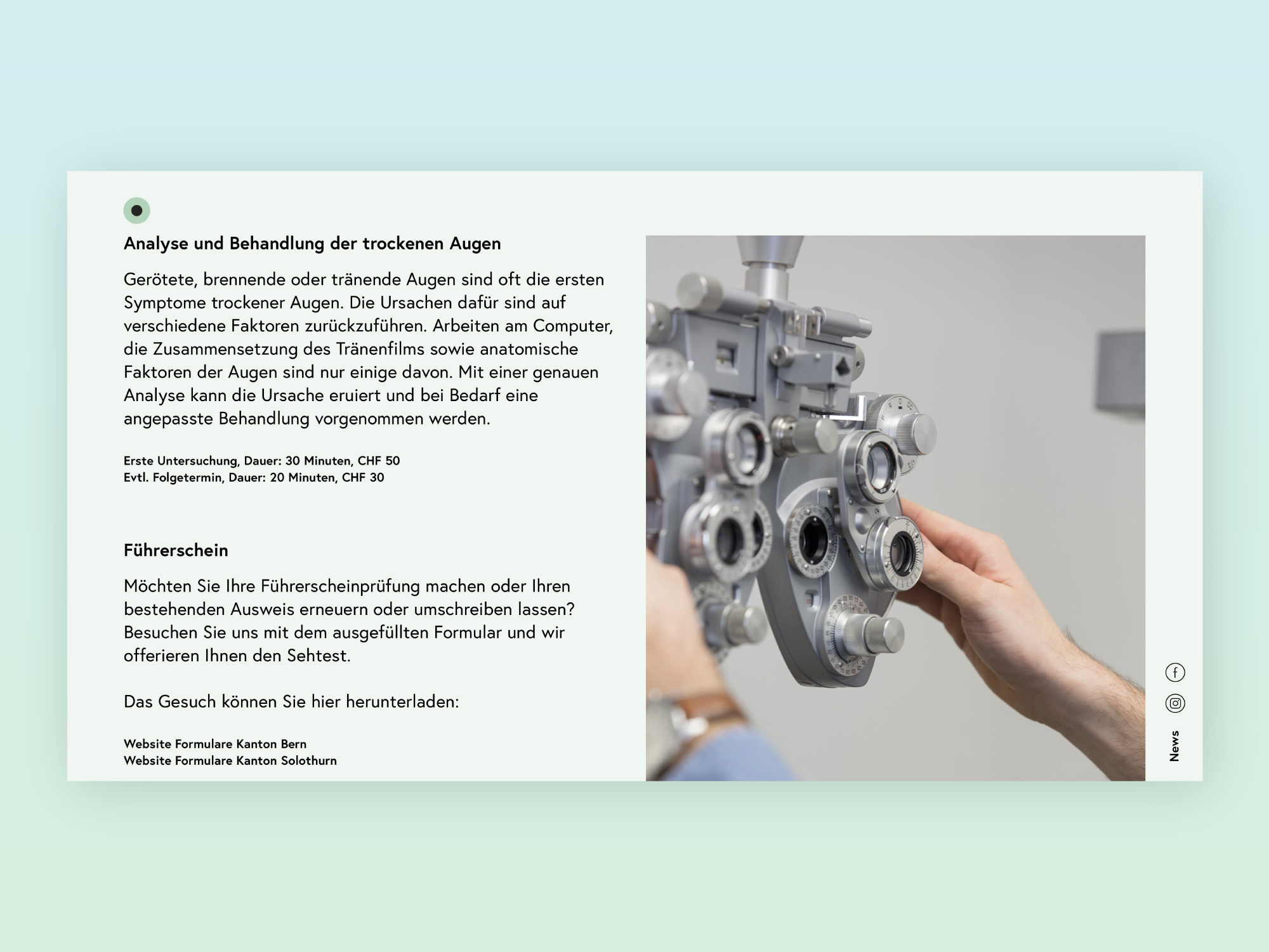 We developed the corporate identity for two extremely likeable opticians from Herzogenbuchsee. The logo consists of three-coloured contact lenses, which can be used as required, depending on the communication medium.