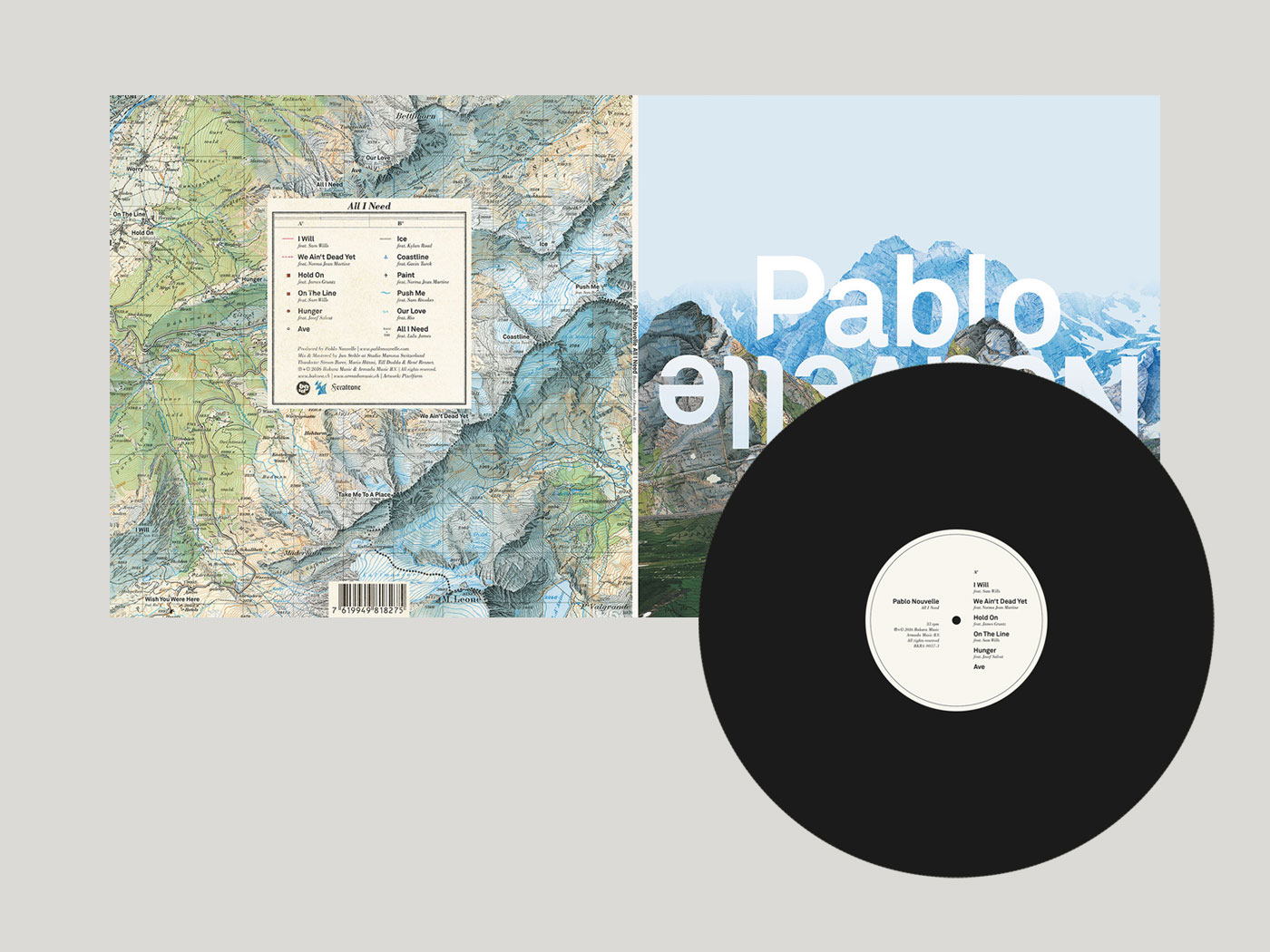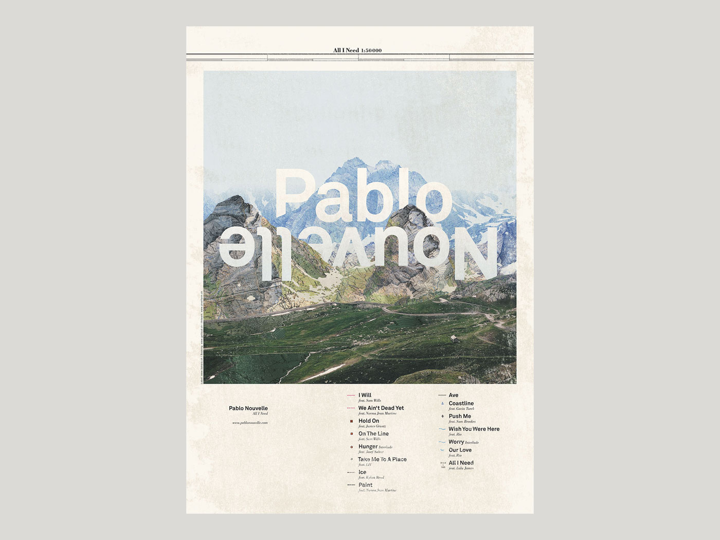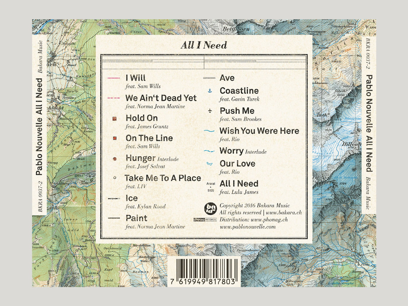 For our long-time colleague, we designed the CD cover and booklet for his album «All I Need». The cover looks like a mountain landscape, but on closer inspection, it consists of sections of a map. The individual song titles are marked. To match the cover and booklet, the CD was laid out as a compass.