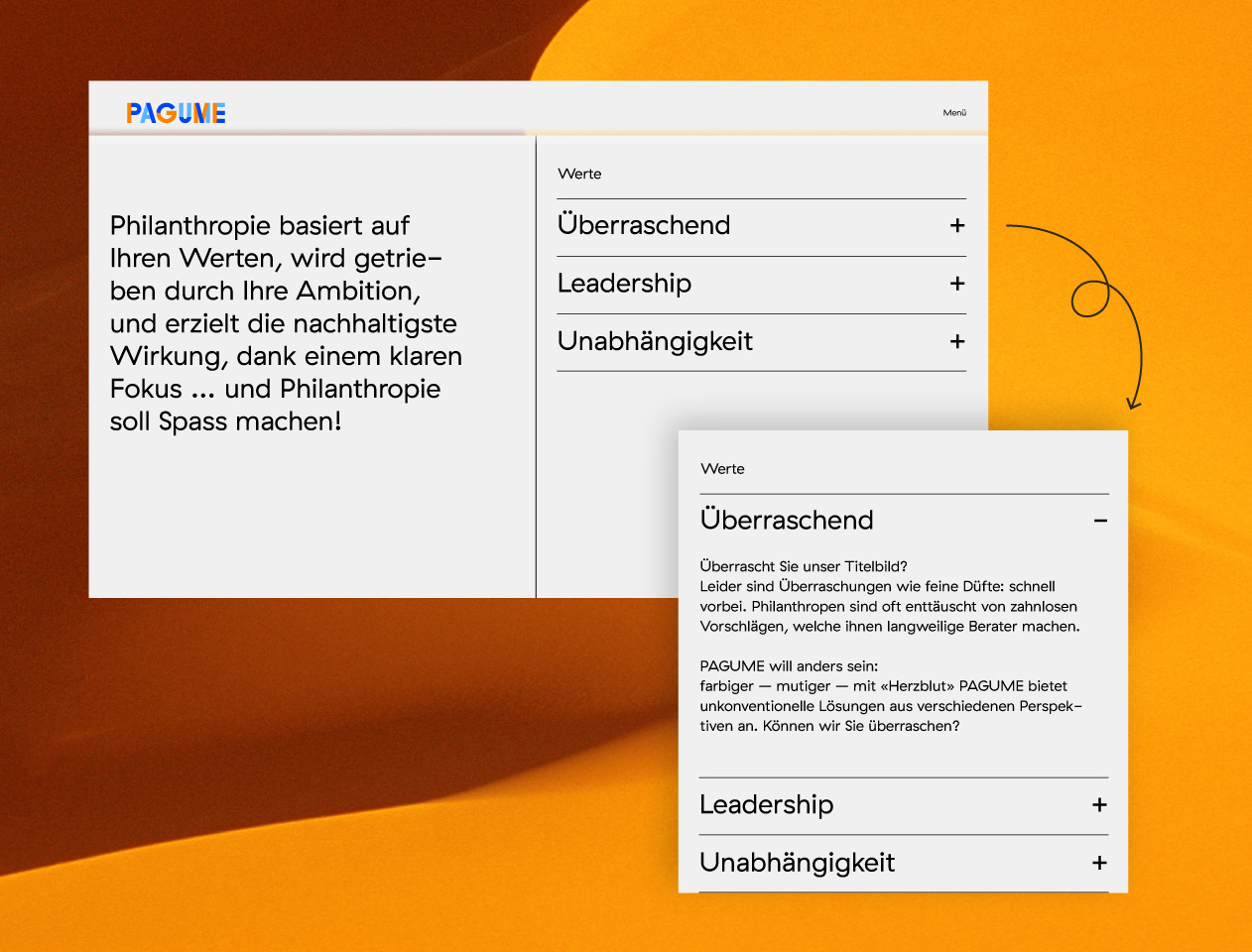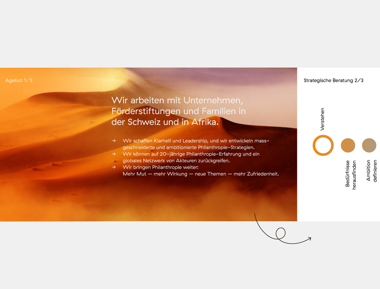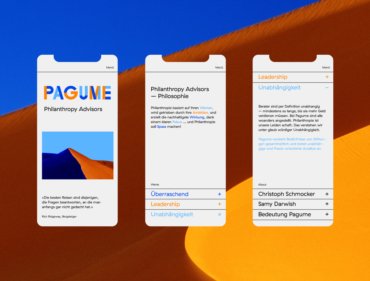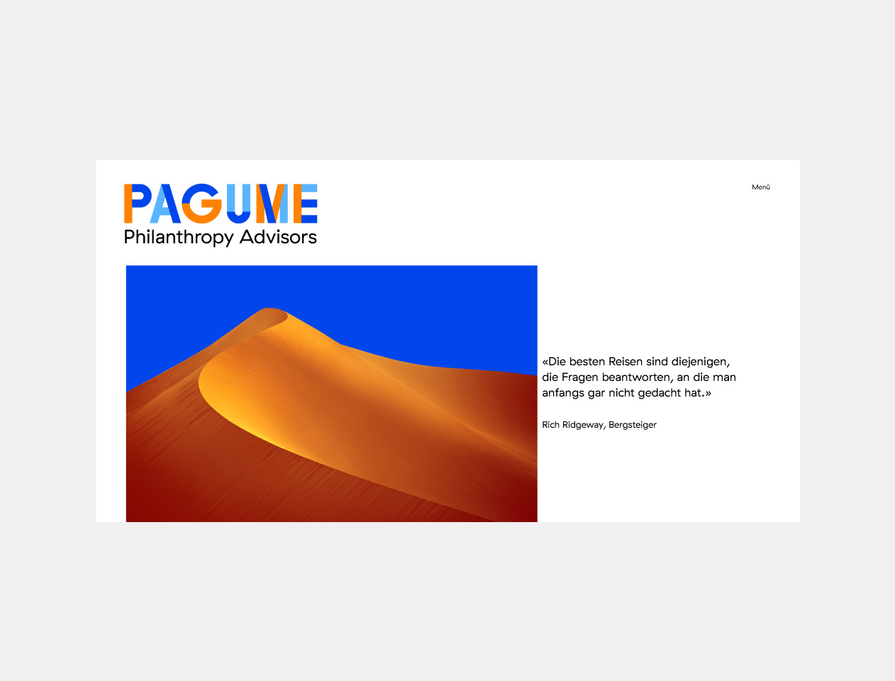 Pagume travaille avec des entreprises, des fondations de soutien et des familles en Suisse et en Afrique. Ils apportent clarté et leadership, et développent des stratégies philanthropiques sur mesure et ambitieuses. Ils avaient déjà le nom. Notre mission consistait à développer pour Christoph Schmocker et Samy Darwish un Corporate Design adapté et pertinent.