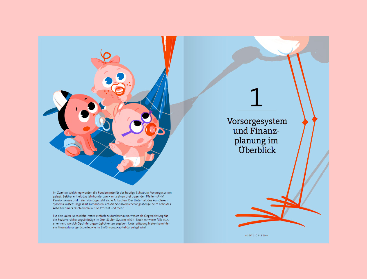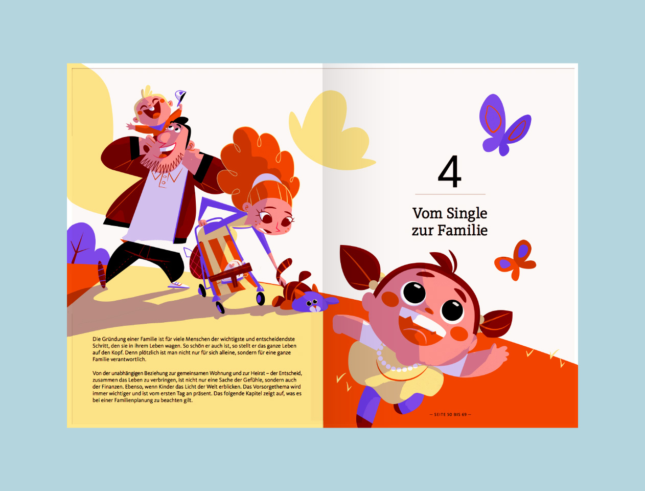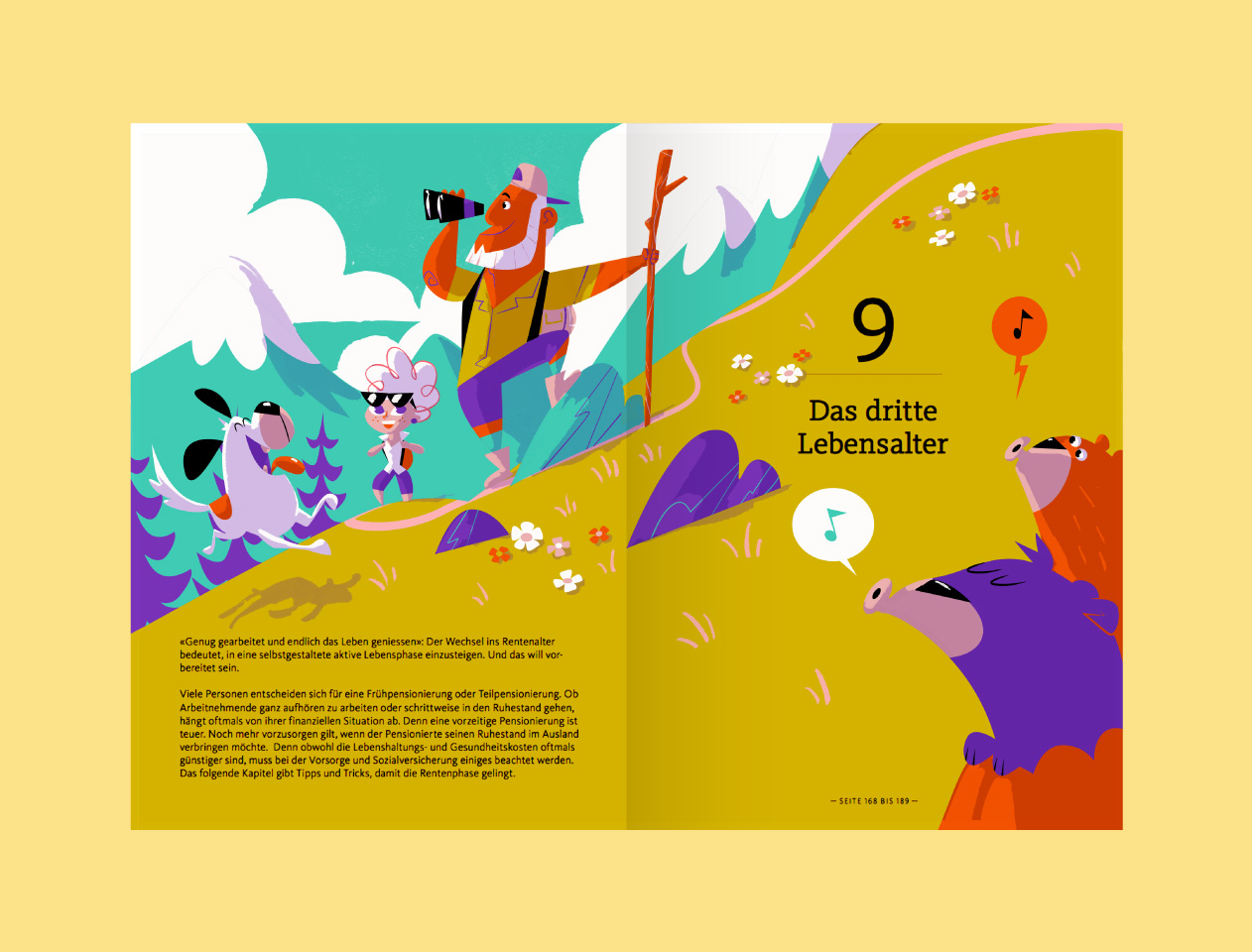 Für die Migros Bank durften wir die 11 Kapitel ihres Finanzplanungsbuches illustrieren. Wir haben drei Hauptcharaktere mit unterschiedlichen Lebensstilen entwickelt, welche die Leser:in von der Vorsorge bis zum Nachlass emotional begleiten.