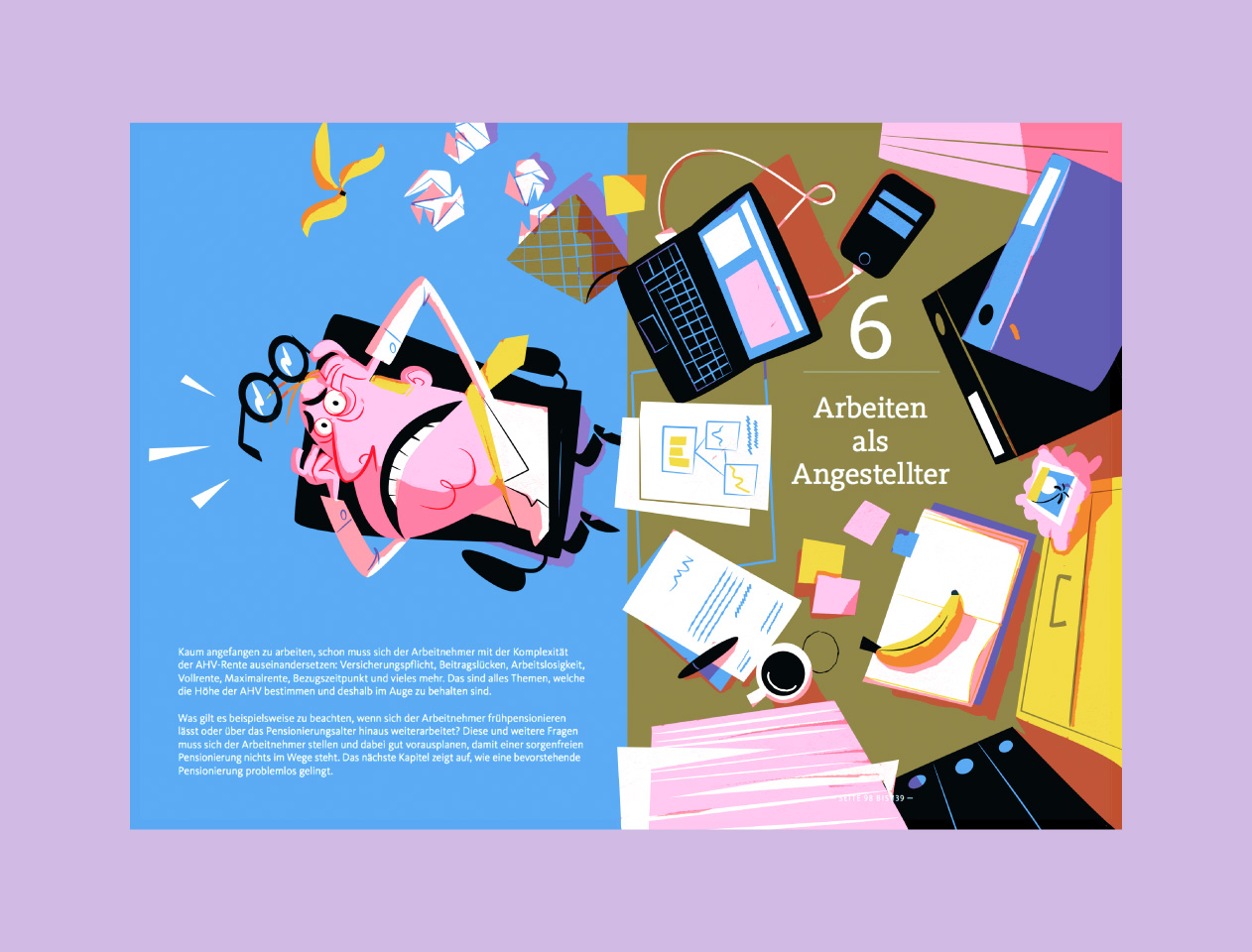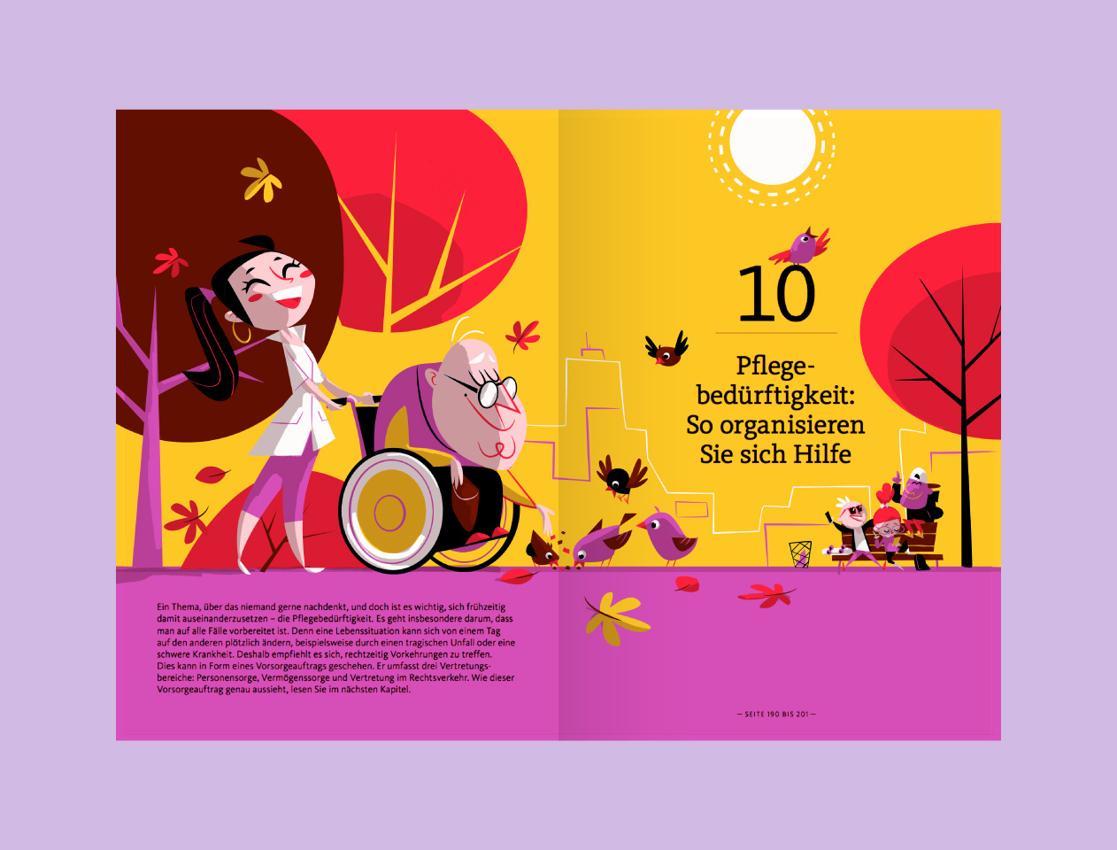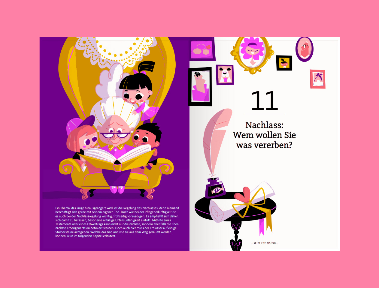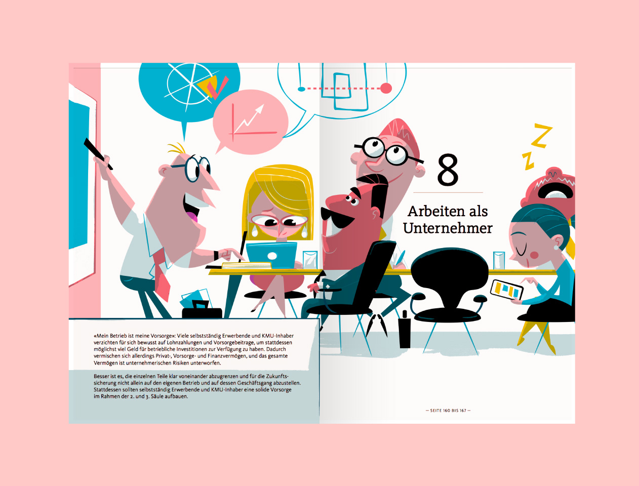 Für die Migros Bank durften wir die 11 Kapitel ihres Finanzplanungsbuches illustrieren. Wir haben drei Hauptcharaktere mit unterschiedlichen Lebensstilen entwickelt, welche die Leser:in von der Vorsorge bis zum Nachlass emotional begleiten.