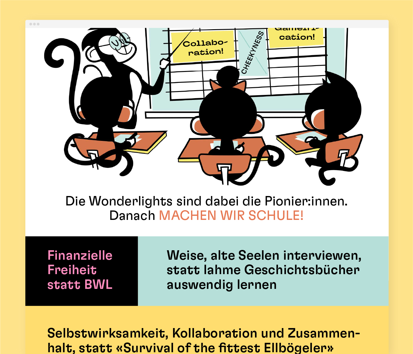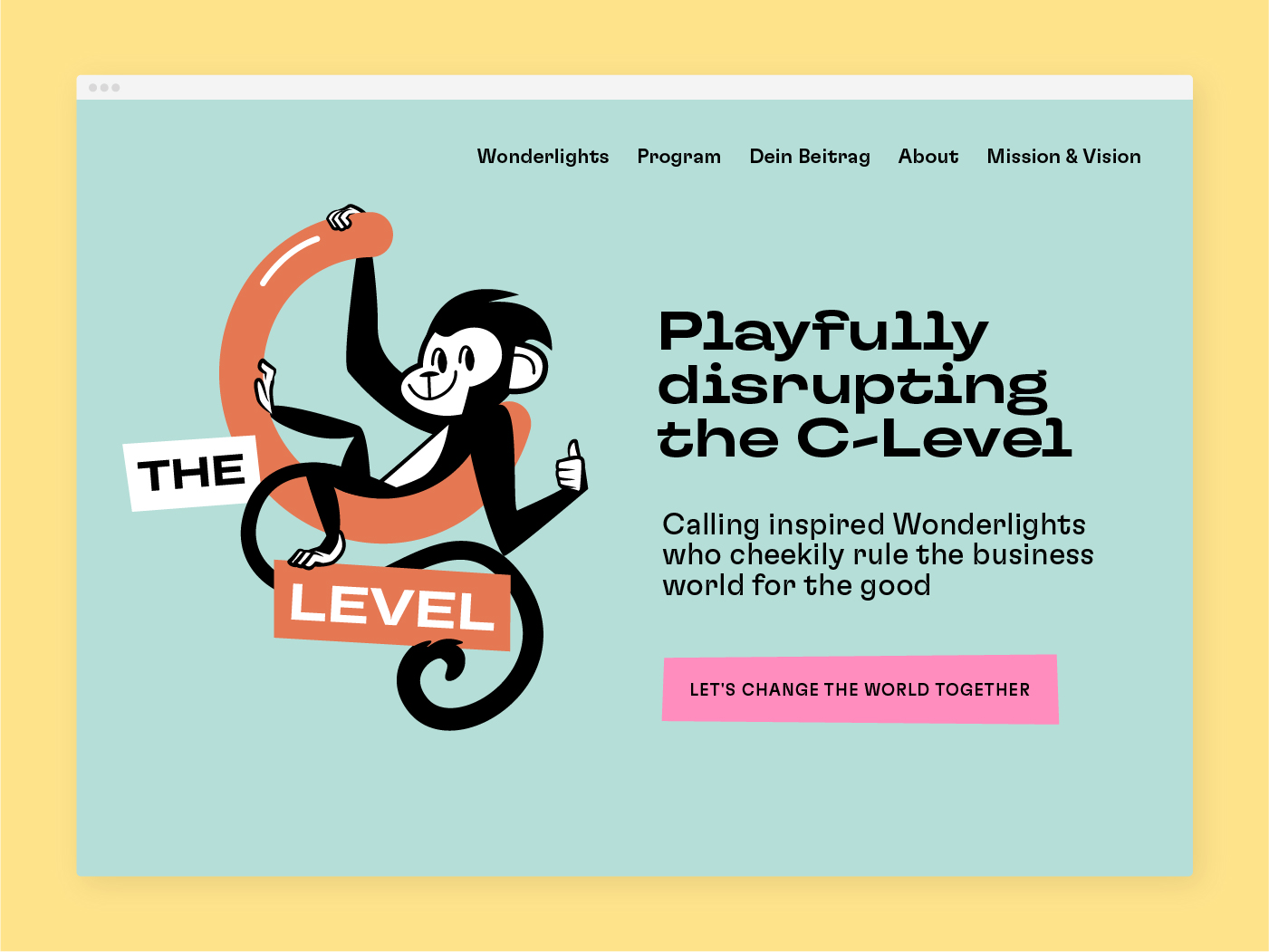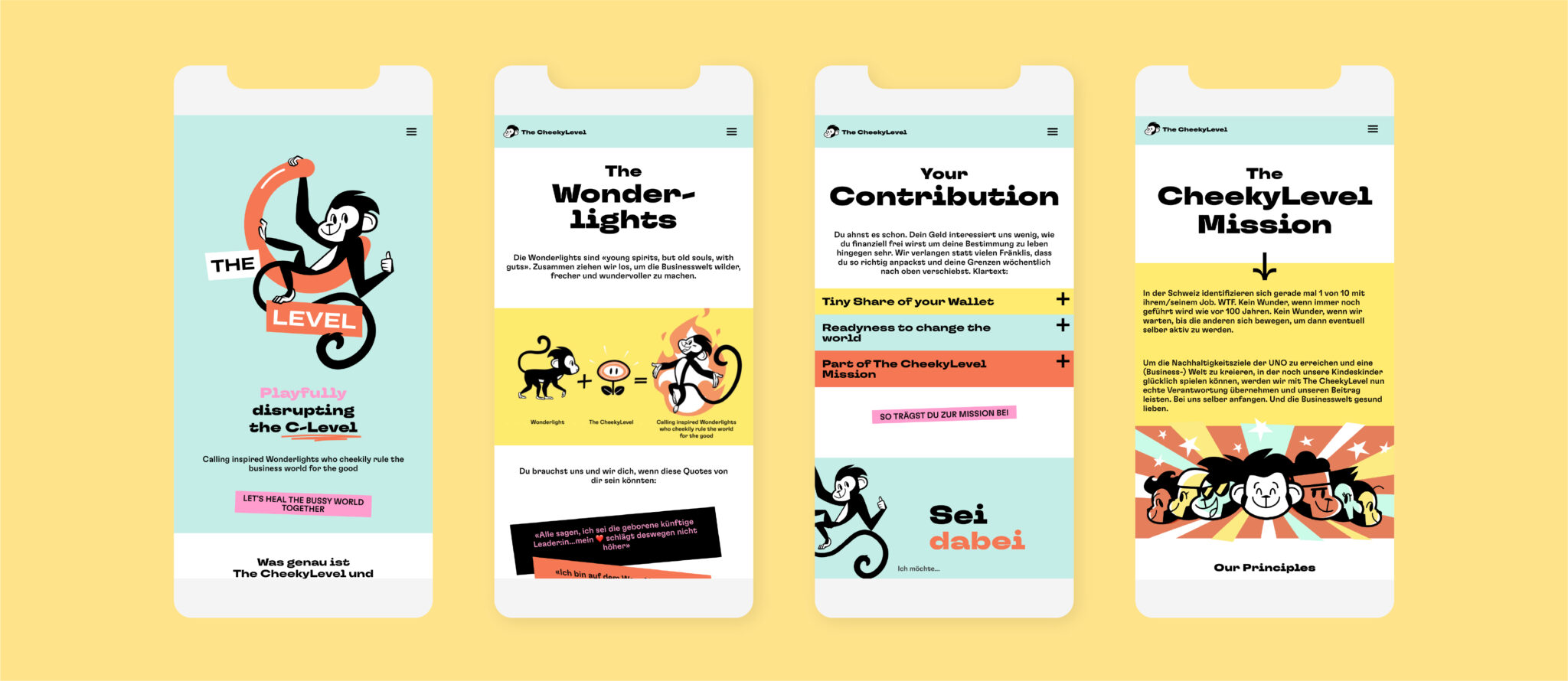 Jedes Jahr bietet The CheekyLevel für sieben Wonderlights Mentoring- und Coachingprogramme an. Wir haben einen cheeky Character entwickelt, der auch als Logo funktioniert und Besucher:innen durch die Website führt. Mit spielerischer Typografie und einer bunten Farbpalette ist das Design maximal unkonventionell sowie The CheekyLevel selbst.